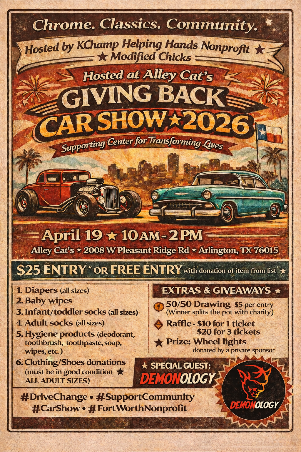 We bring the community together through monthly car shows, car meets, and hands-on service events, using these gatherings not only to unite people with shared interests but also to raise support for those who need it most.