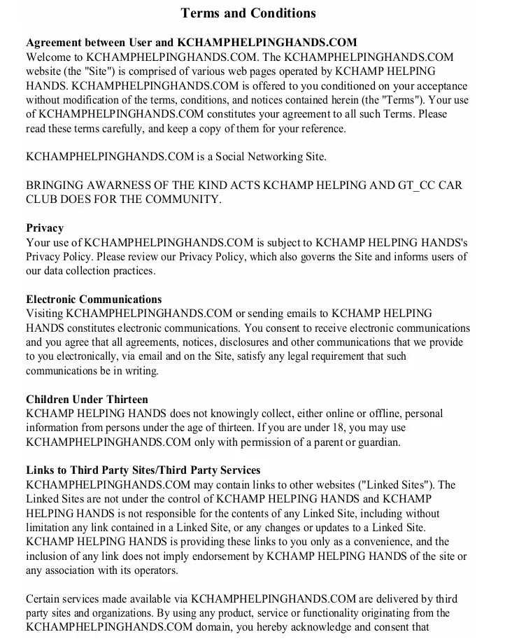 Kchamp Helping Hands does not now, nor will it in the future, sell, rent or lease any of its customer lists and/or names to any third parties. Kchamp Helping Hands may collect and may make use of personal information to assist in the operation of our website and to ensure delivery of the services you need and request. At times, we may find it necessary to use personally identifiable information as a means to keep you informed of other possible products and/or services that may be available to you from kchamphelpinghands.com and its subsidiaries. Kchamp Helping Hands and its subsidiaries may also be in contact with you with regards to completing surveys and/or research questionnaires related to your opinion of current or potential future services that may be offered. Kchamp Helping Hands uses various third-party social media features including but not limited to INSTAGRAM, TIKTOK and other interactive programs. These may collect your IP address and require cookies to work properly. These services are governed by the privacy policies of the providers and are not within Kchamp Helping Hands's control.